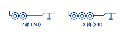 コンテナを載せる台車。重量に応じて2軸(40Fで24tまで)と3軸(40Fで30tまで)を使い分ける。