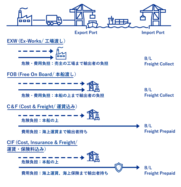 貿易条件(インコタームズ)は、輸出者と輸入者の間で「危険負担」と「費用負担」がどこで切り替わるかを定めた国際ルールです。